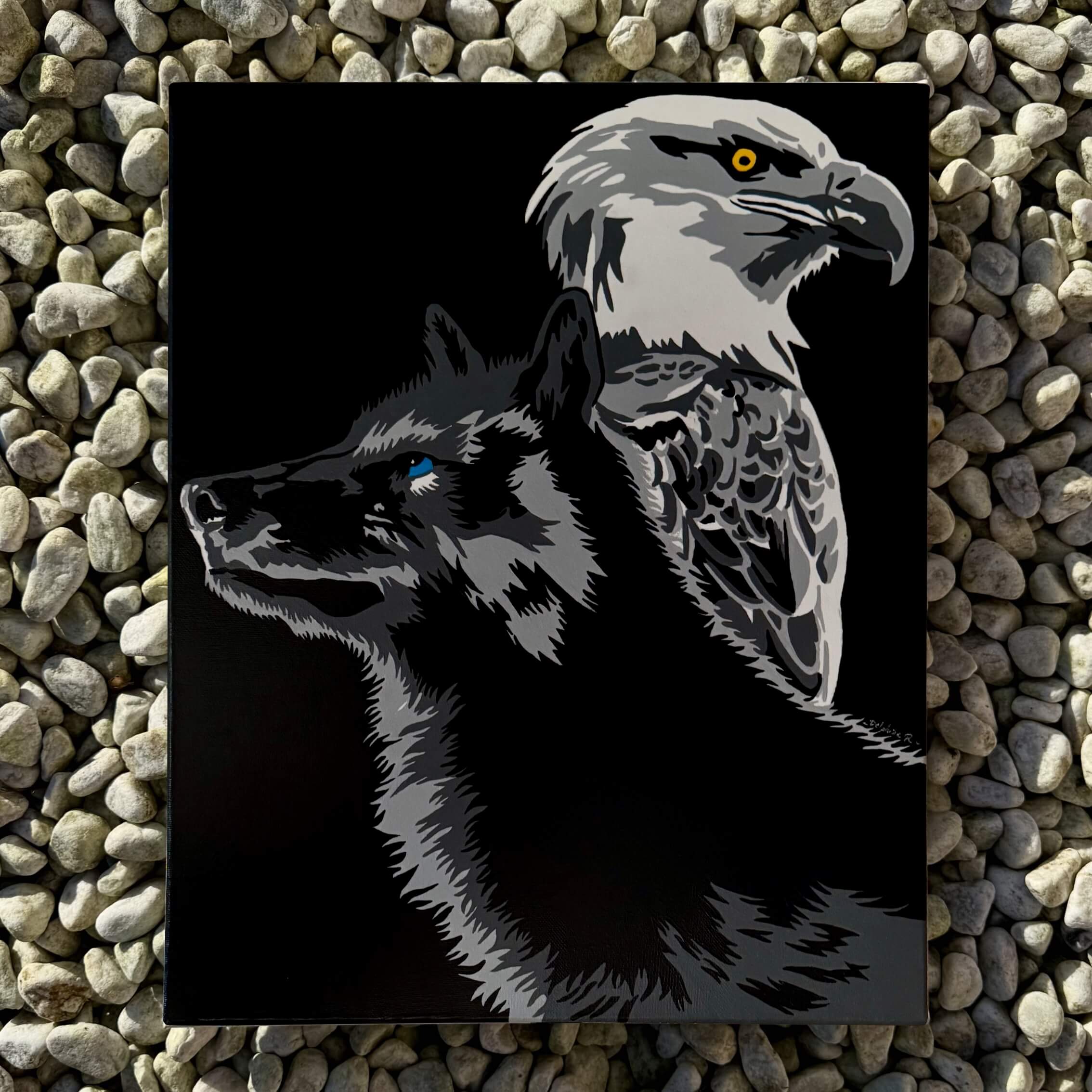 “Esprits sauvages”, plongez dans l’intensité sauvage avec ce pop art en noir et blanc : un loup et un pygargue aux regards perçants colorés, symboles de liberté et de force.