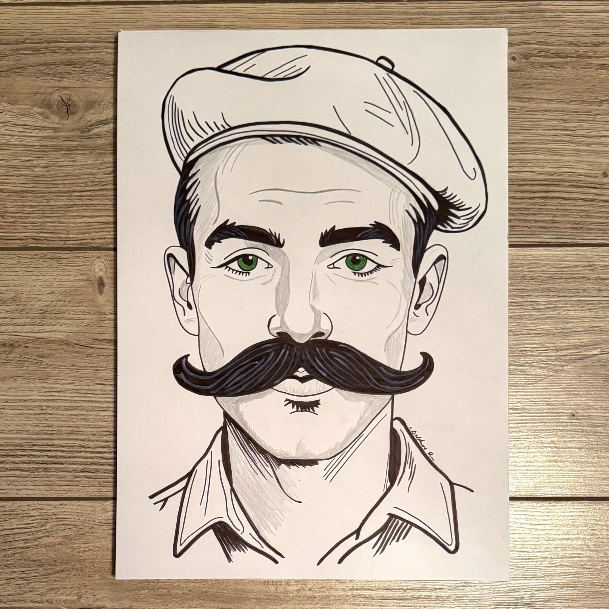 Un portrait unique réalisé au feutre, mettant en scène un homme à la moustache imposante avec des yeux verts perçants. Une création expressive et moderne qui attire le regard et donne du caractère à votre décoration.