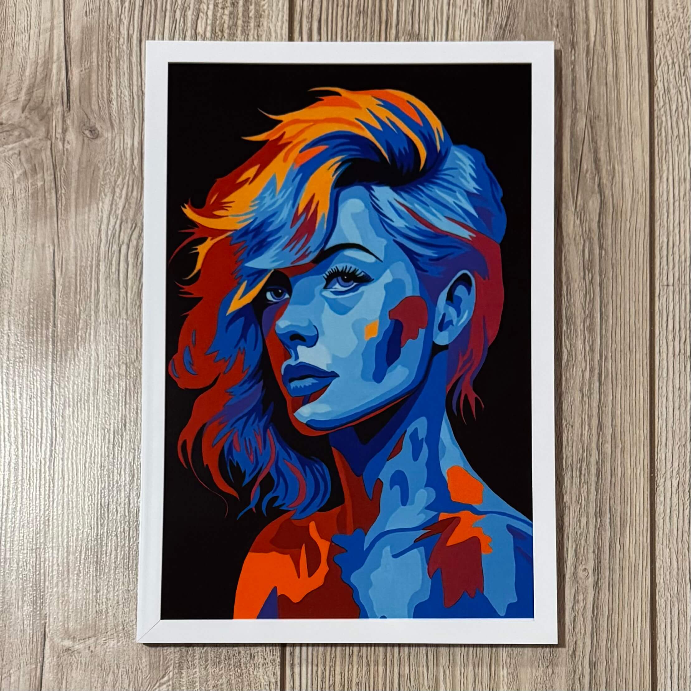 Reproduction sur aluminium au format 20×30 cm du tableau « Beauté Azur », représentant une femme dans un style pop art aux tons bleus sur fond noir. Une œuvre élégante et contemporaine, où l’intensité du regard et la profondeur des couleurs créent une atmosphère à la fois moderne et envoûtante. Idéale pour sublimer un intérieur avec une touche artistique raffinée.
