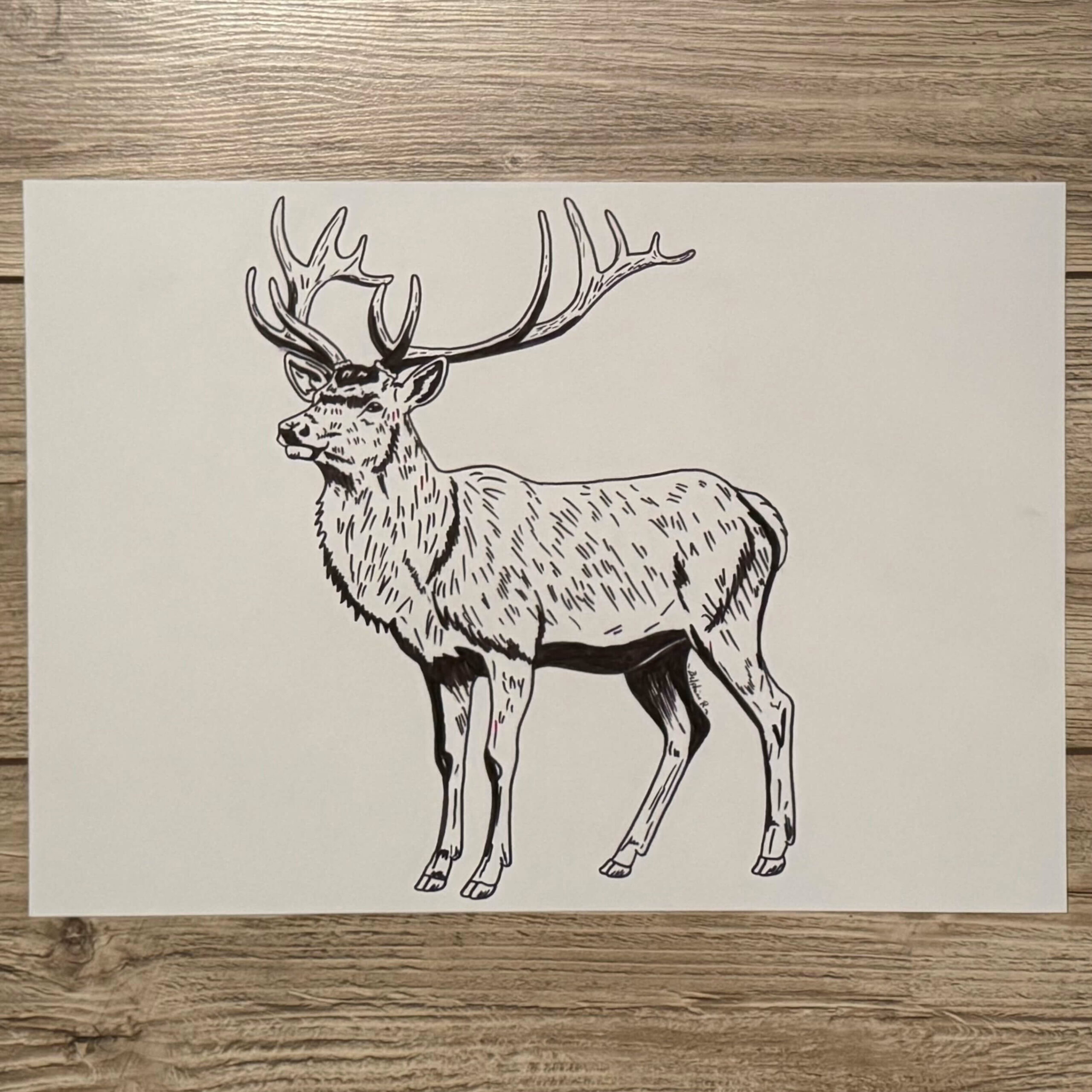 Un cerf dessiné au feutre noir, dans une approche graphique et épurée.
